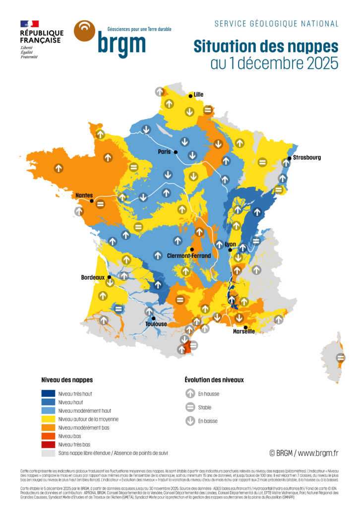 Le bulletin de situation hydrogéologique au 1er décembre 2025 révèle une recharge en cours mais aux résultats contrastés selon les territoires et le type de nappes.