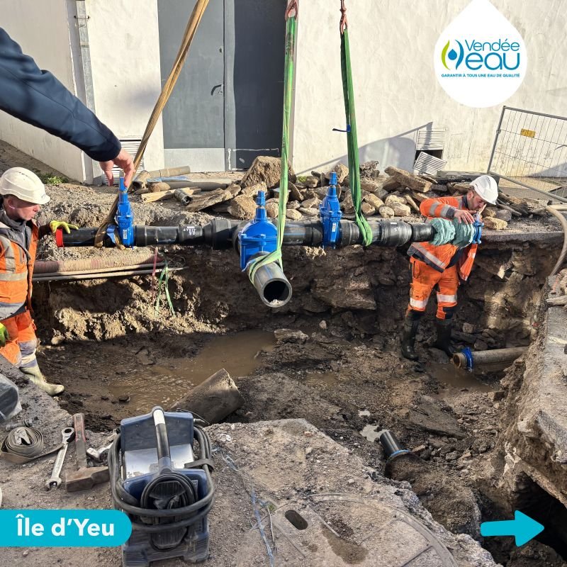 Renouvellement d’un réseau Ø250 mm sur plus de 1 km entre la bâche du Marais Salé et le réservoir de Port-Joinville. Les travaux se poursuivent jusqu’à fin avril.